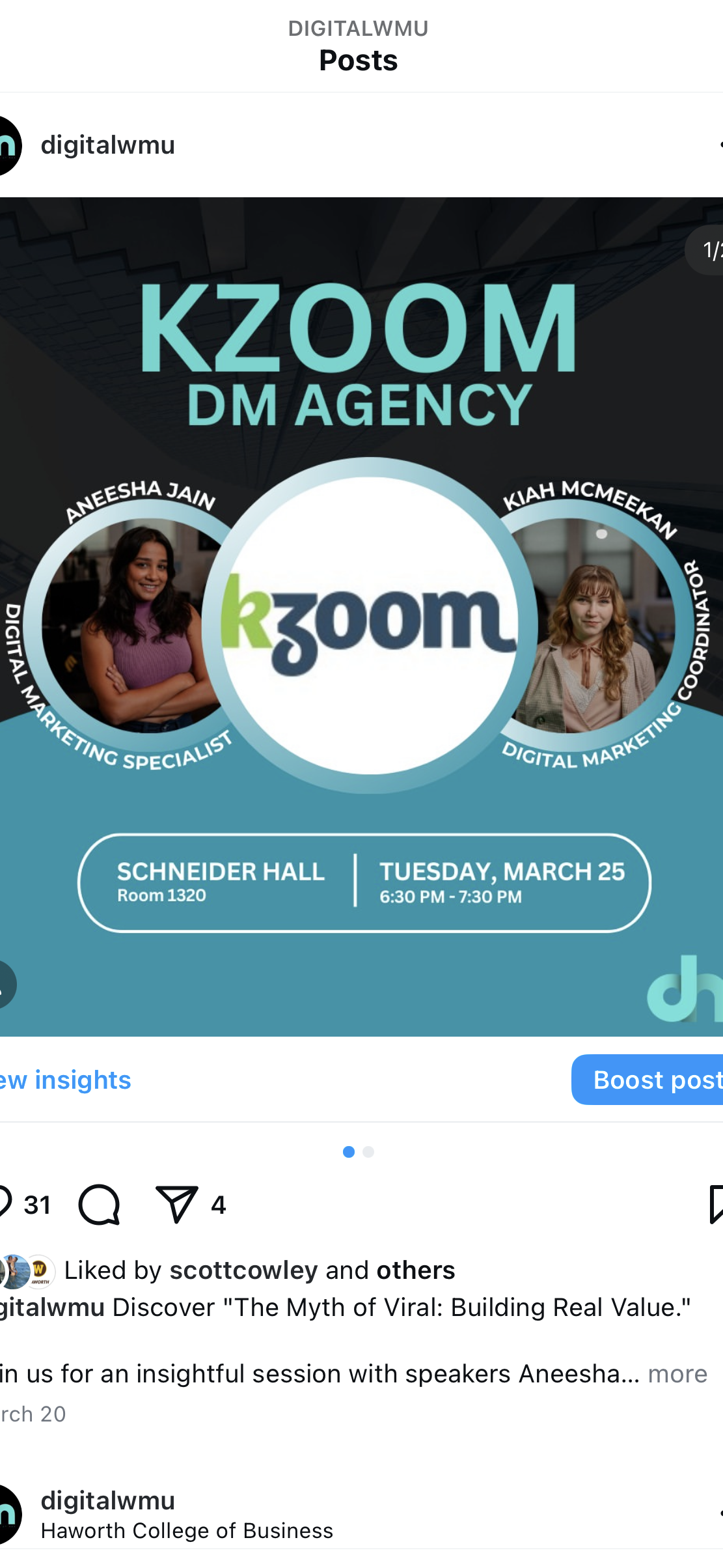 “Her collection of social media marketing skills has been developed from multiple applied experiences and classroom initiatives. Importantly, she also has taken on a leadership role for a prominent on campus student group, which also highlights her maturity and time management abilities.”